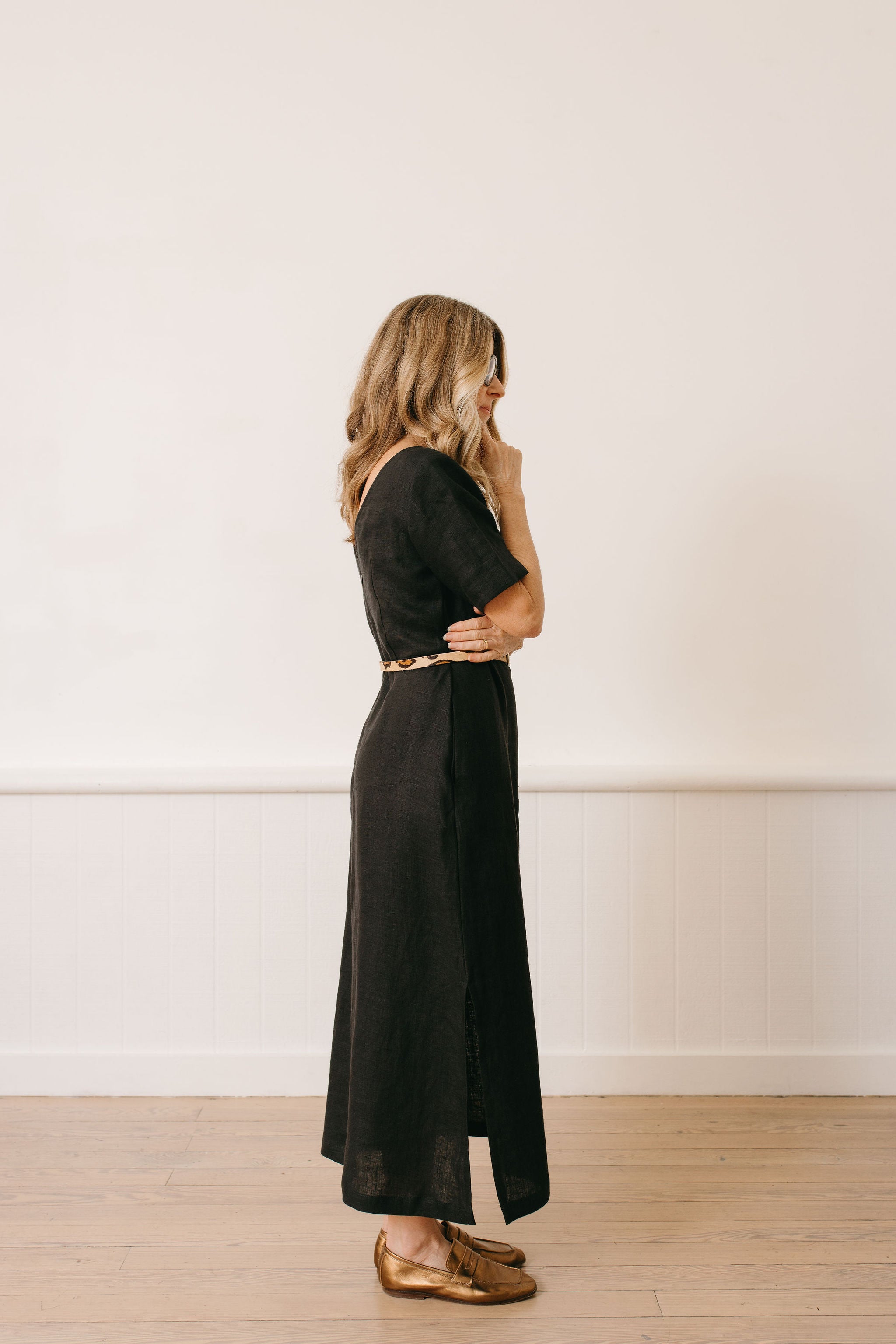 100% Linen. The Claire is made in a beautiful medium weight linen in black.