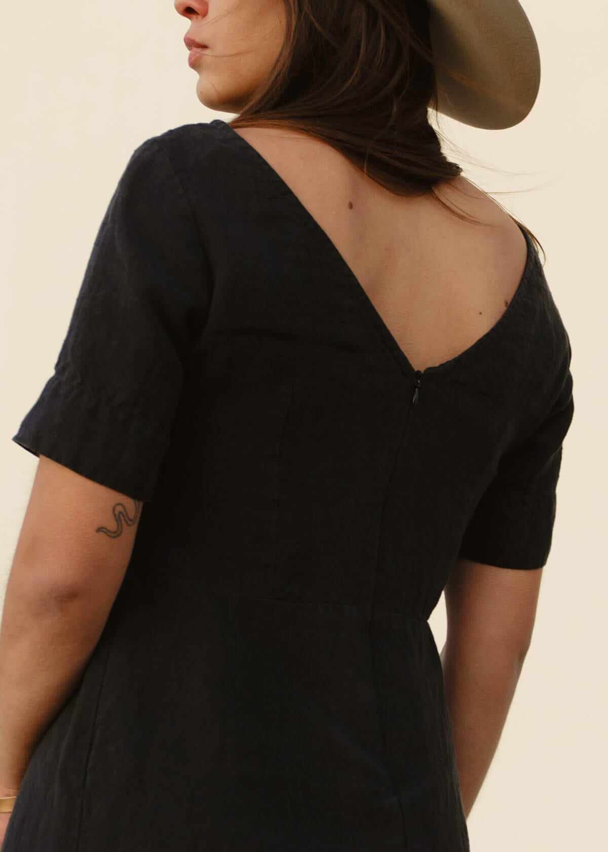 100% Linen. The Claire is made in a medium weight linen in a beautiful natural (slight blush tone) and black.