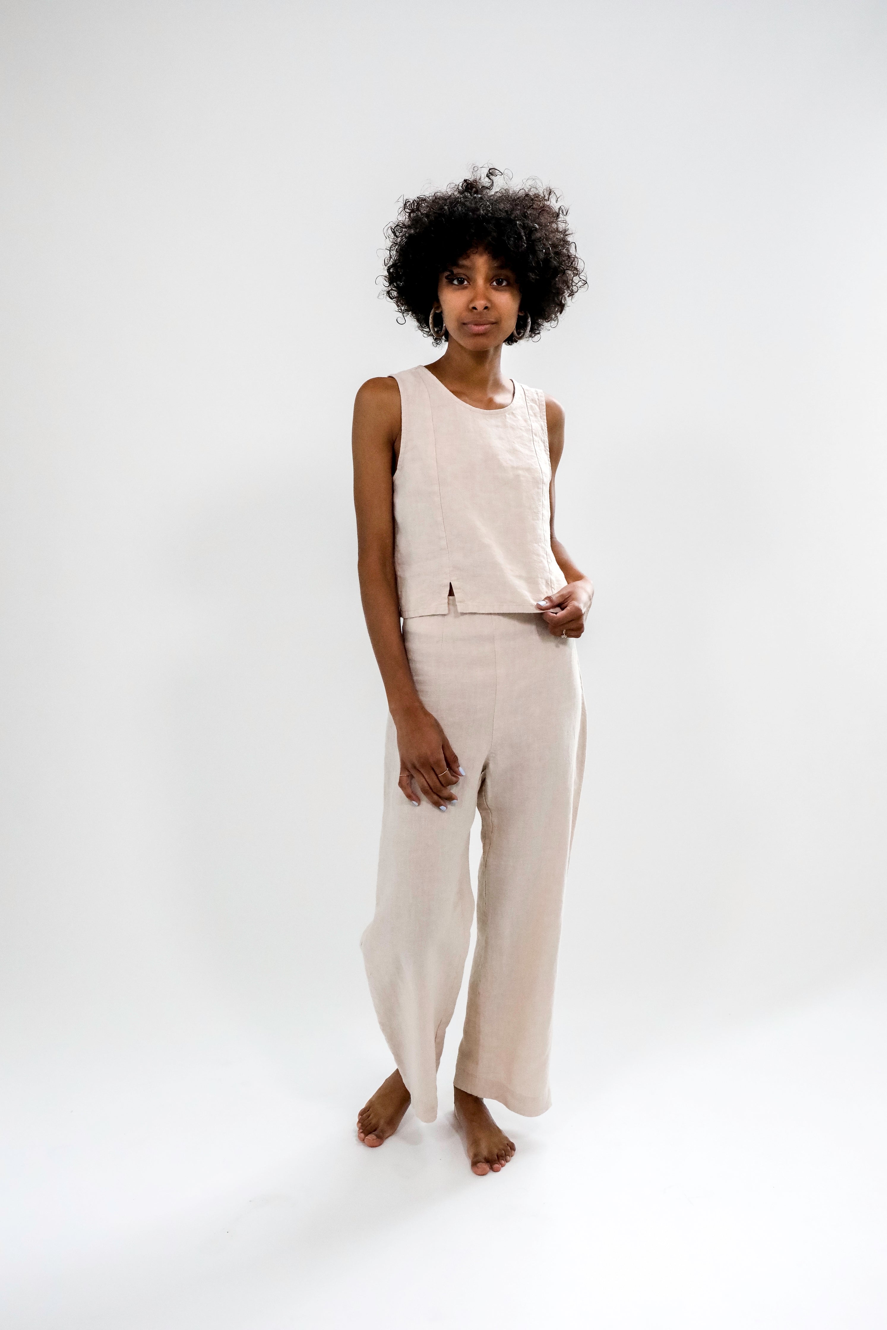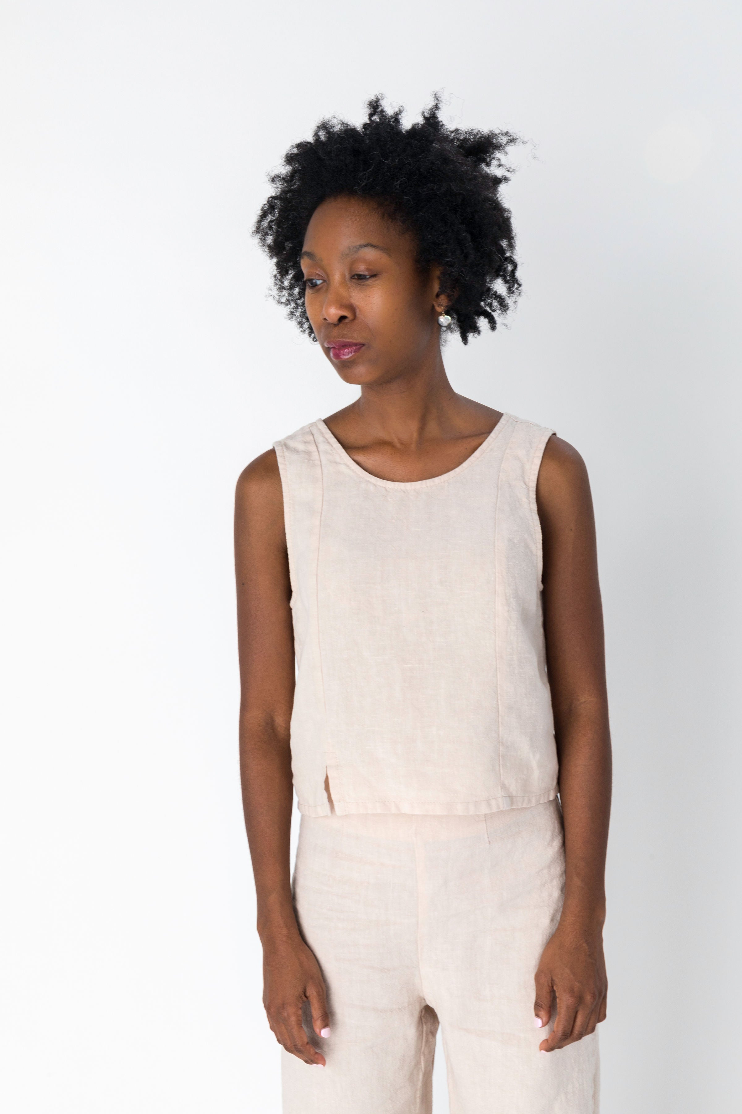 The Mari Top is your effortless sleeveless crop top with princess seams, small slit on side front, V in back. Reversible.